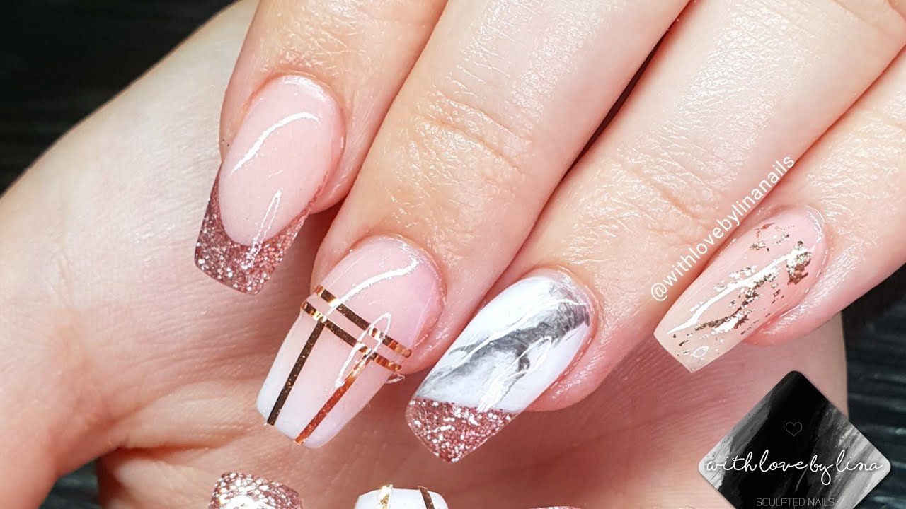 rose gold nail marble nails acrylic designs lining pink chrome glitter painted summer