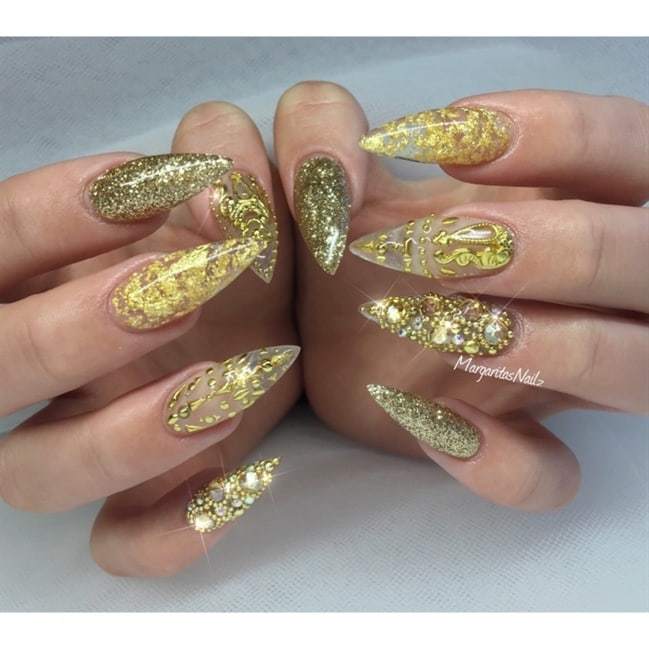nails stiletto nail christmas designs elegant bling golden stilettos valentine rojas manicure styling most gel swarovski unas gold lines seshell