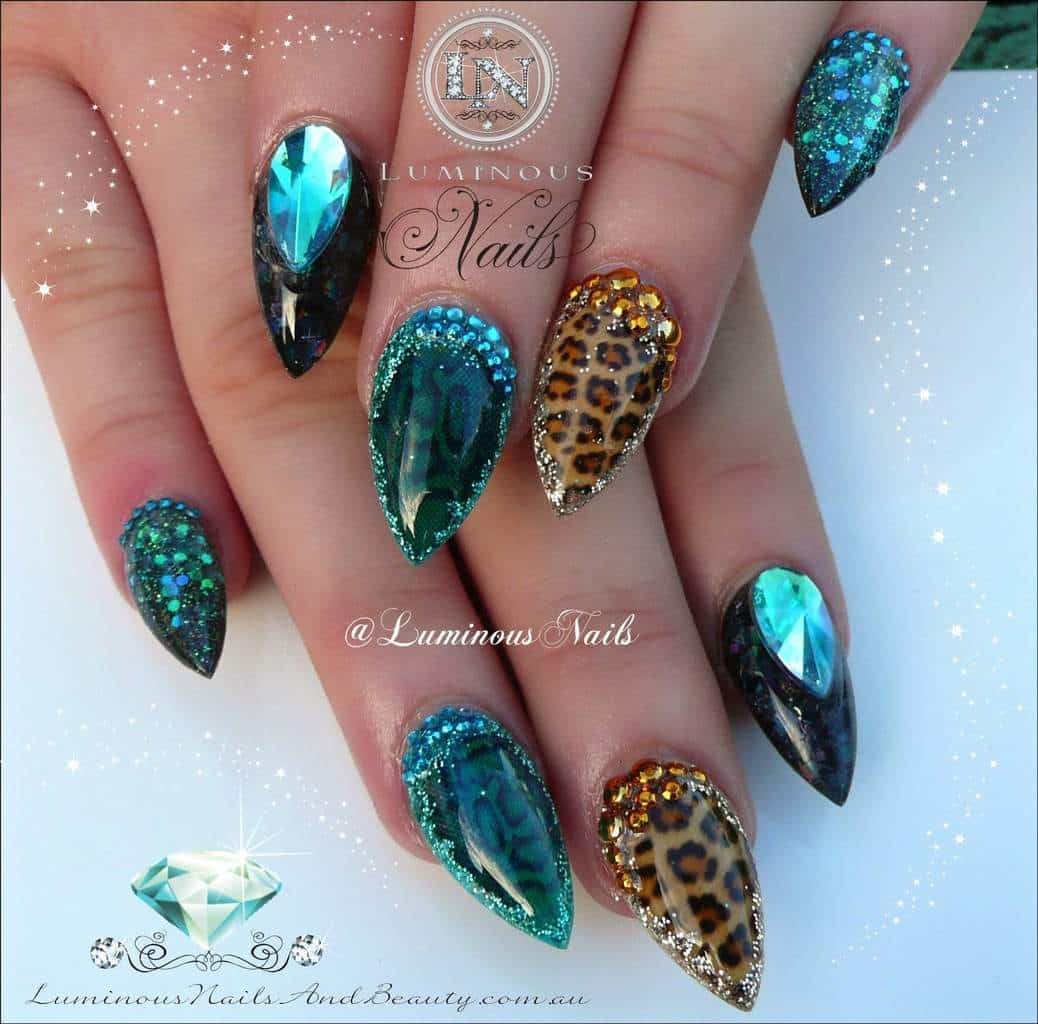 nail bling nails leopard snake acrylic skin stiletto luminous rainbow turquoise luminousnails animal prints emerald purple crystals coffin sculptured naildesigncode